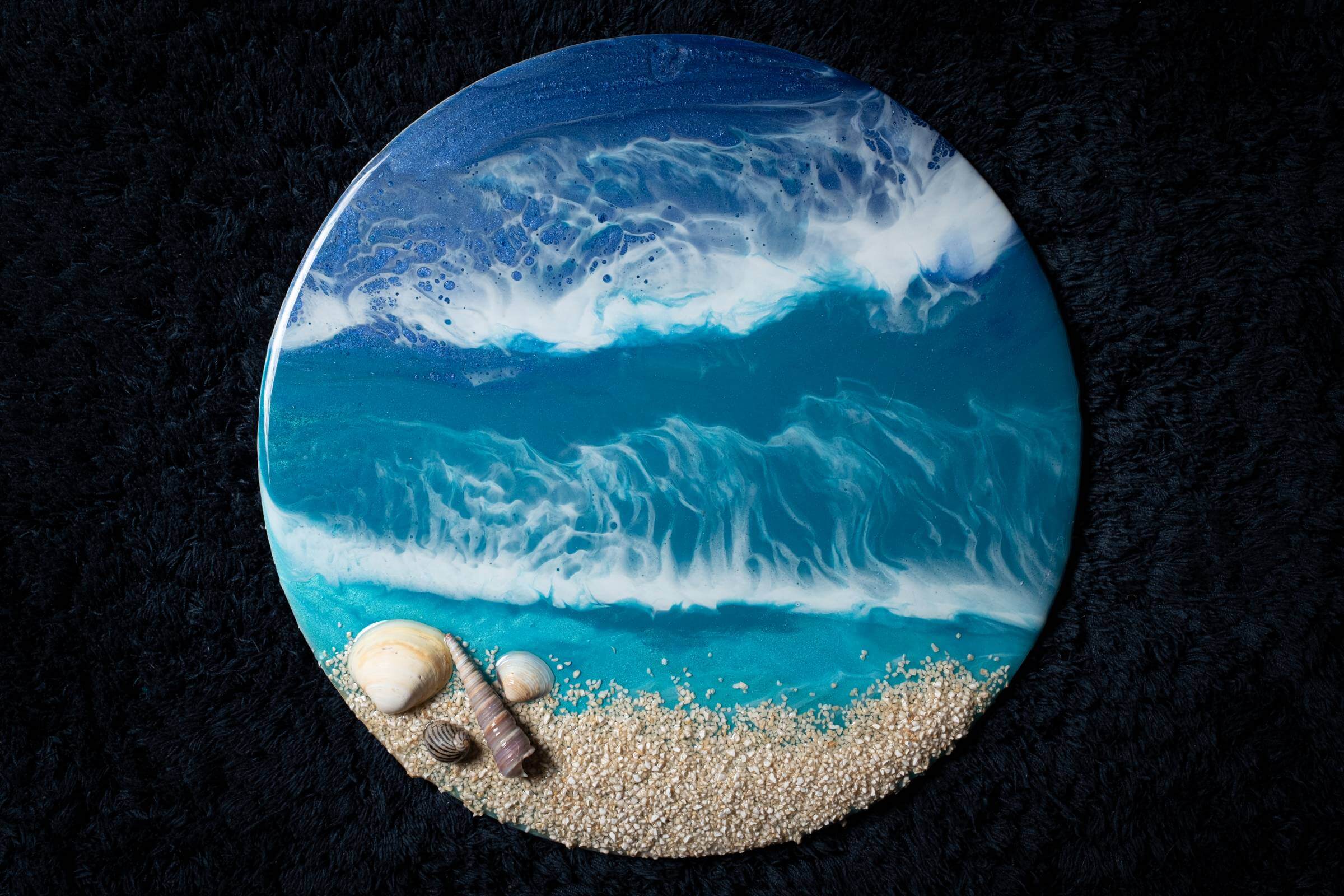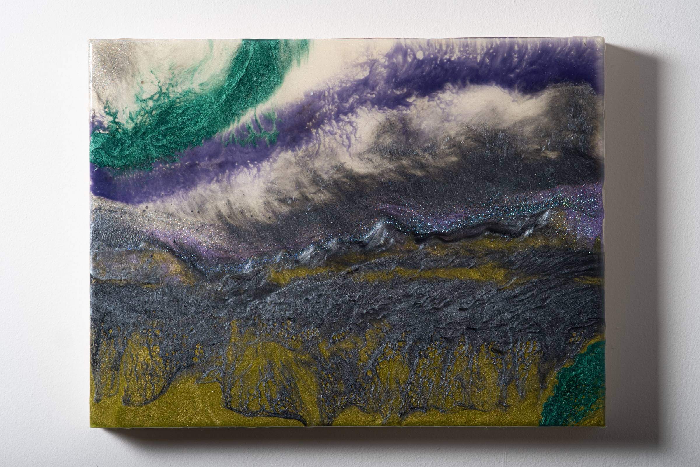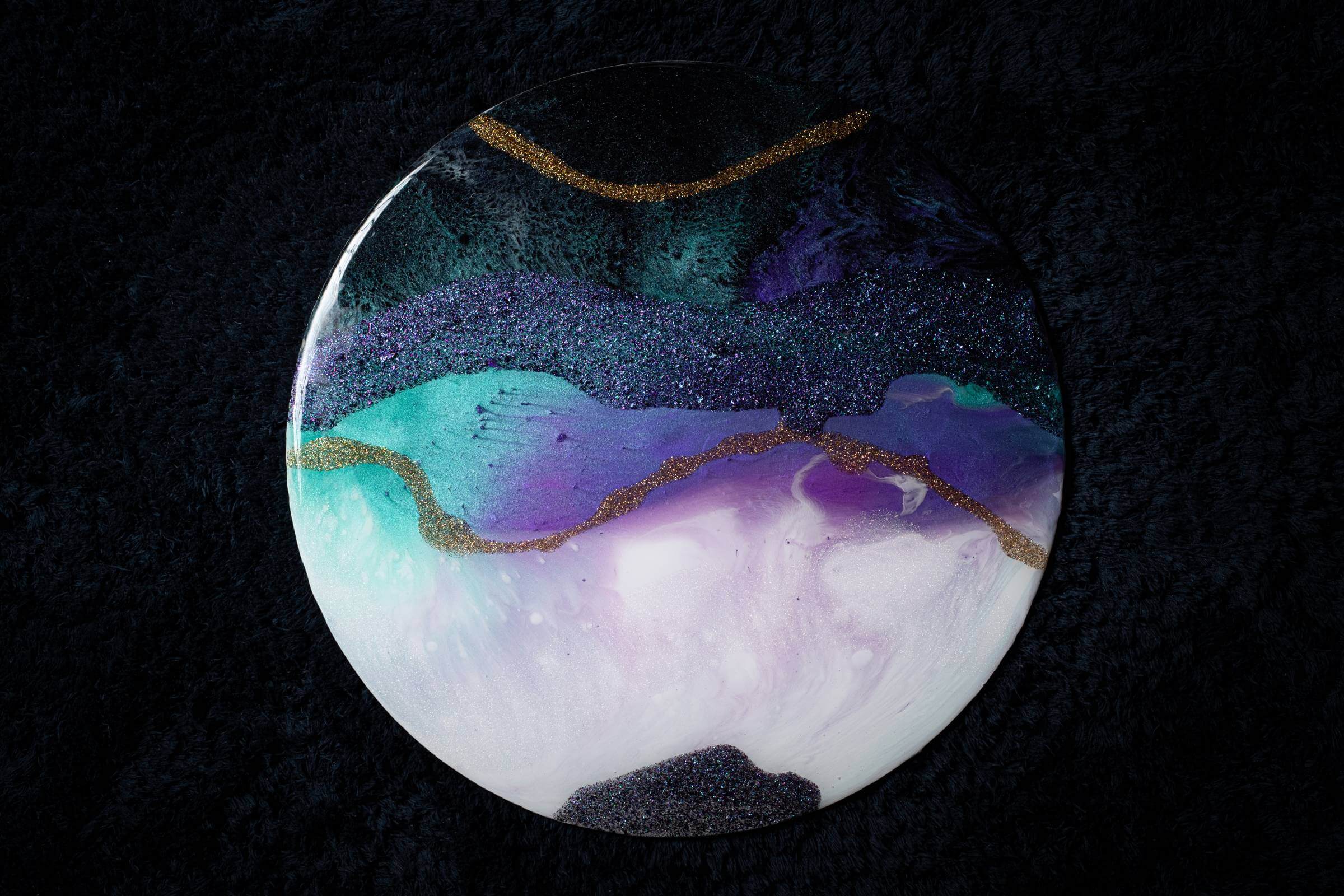 Epoxy resin is a two-part compound that is mixed to create a medium that you can add pigments to. It starts as a liquid, which after adding colour hardens over a period of usually 24 hours. It can be used in a variety of ways, but when used to create paintings it produces amazing results, though layering and manipulating the medium. Semi-precious stones and crystals are also used to enhance some of the creations. The result upon completion is a beautiful piece of art with a high gloss finish. All my resin art is made on MDF or cradled wooden boards.
